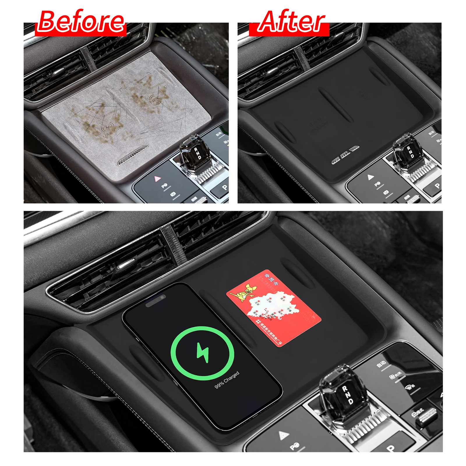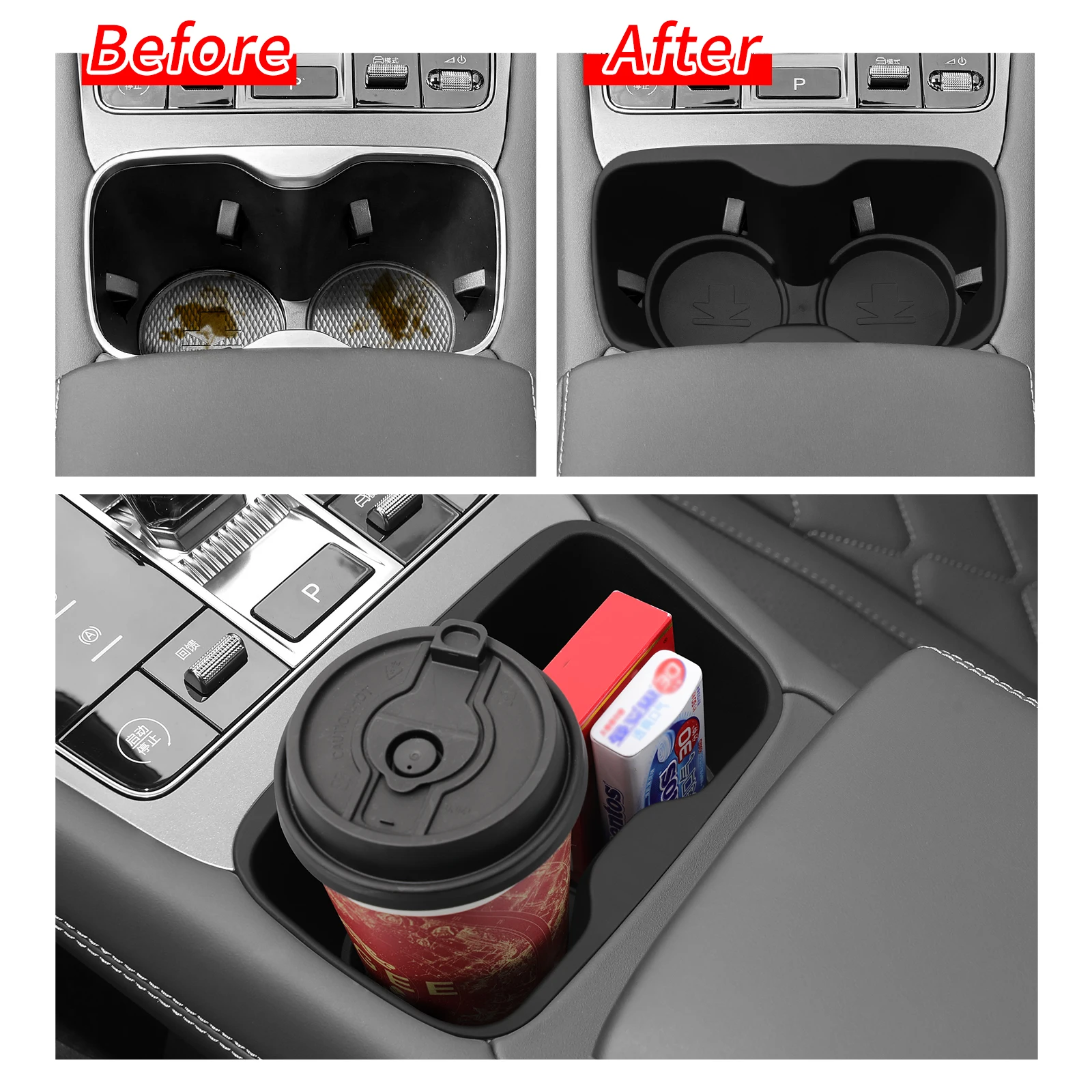 - Fits center console/tray and cup holder zones — check images for placement guide